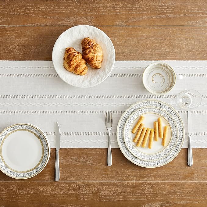 Christmas Table Runner, White 13x48 Inch, Hemstitched Farmhouse Cotton Linen Boho Table Runners 48 Inches Long, Embroidered Striped Rustic Home Decor