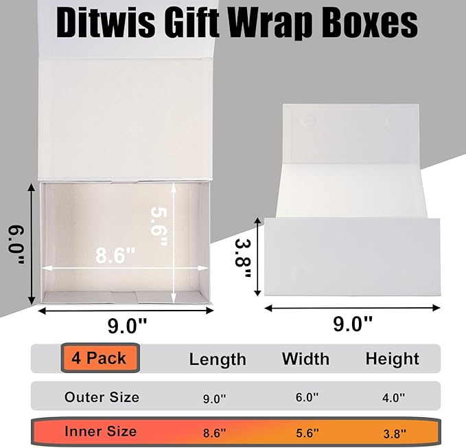 - Great Size: The 4 Pack 9x6x4 inches gift boxes with lids can hold gifts such as chocolates, cosmetics, skincare, perfumes, clothing accessories or handmade products, etc. Not just for gift-giving but also as a more lovely storage option for various office and personal items.