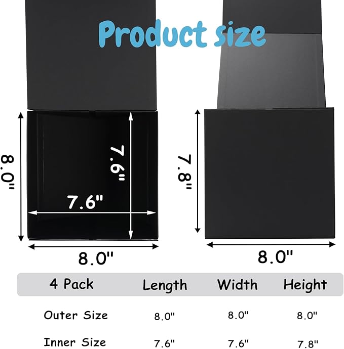 - Mutifuctional Box: These gift boxes for presents measure 8x8x8 inches and come in a set of 4. They can pack cups, makeup, candy, jewelry, and other gifts. Very suitable for being used as gift boxes