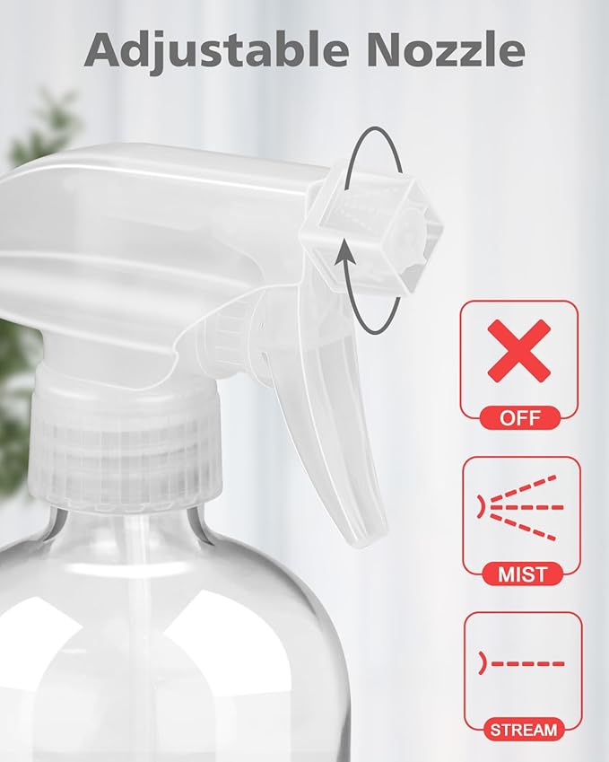 - Leak-Proof: Clear glass spray bottle with labels is paired with a squeeze trigger nozzle and a replacement black cap. And the bottle will not leak.