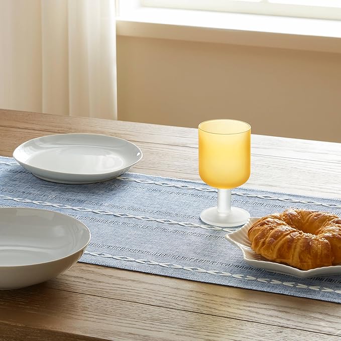 Hemstitched Farmhouse Table Runner, Blue 13x48 Inch, Cotton Linen Table Runners 48 Inches Long, Embroidered Striped Blue Boho Table Runner Rustic Home Decor