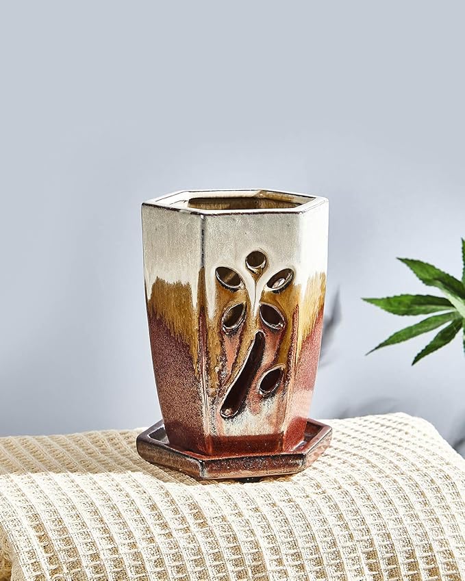 vensovo 4 Inch Ceramic Orchid Pots with Holes and Saucers - 1 Pcs Small Hexagon Succulent Pot for Repotting, Garden Flowerpots for Plants Indoor and Outdoor Promotes Air Circulation, (Brown Mixed)