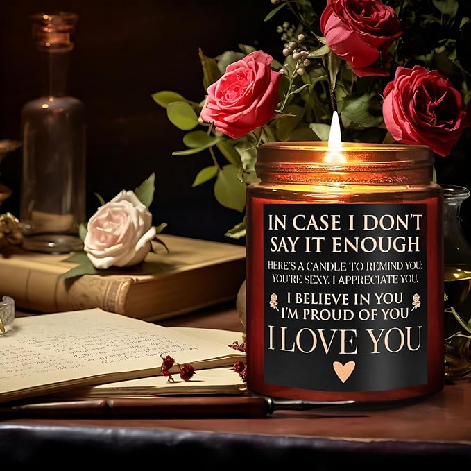 - 🌺UNIQUE COUPLE GIFTS FOR MEN & WOMEN: In the warm glow of our amber jar, this scented candle delivers more than just fragrance - it’s a daily dose of positivity. With a label that reads, “IN CASE I DON’T SAY IT ENOUGH,” this candle whispers sweet affirmations to you: “You’re sexy. I appreciate you. I believe in you. I’m proud of you. I love you.” Light it up, breathe in the soothing scent, and let these words wrap around you like a cozy embrace.