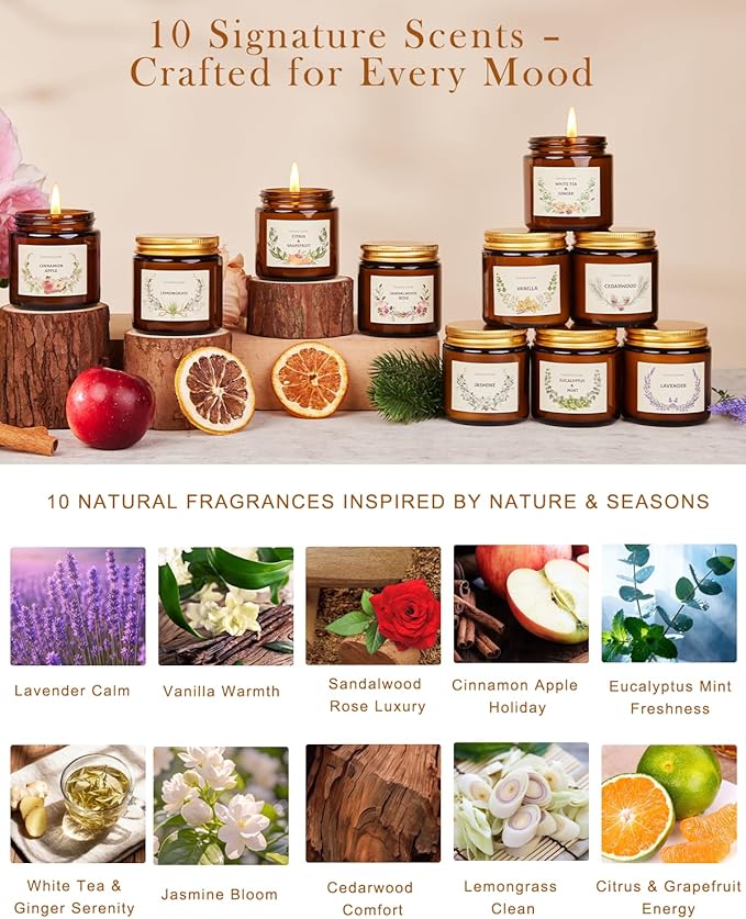 - 【Elegant Gift Box, Ready for Christmas Giving】- Each candle comes in a reusable amber jar and all ten are presented in a beautifully designed holiday gift box. A timeless and elegant set for Christmas, birthdays, or housewarmings — a gift that brings light, love, and festive spirit to any home.