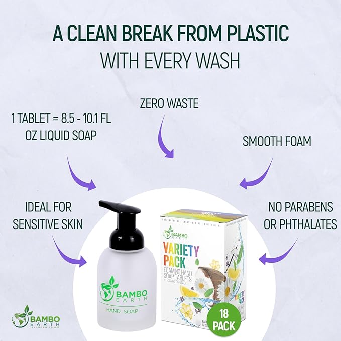 - ✔️18 PACK HIGHEST QUALITY SMART SOAP FOAMING TABLETS! Our natural non-irritating pods come with a cleansing method formula that contains no harsh ingredients and is gentle to the skin! The moisturizing foam is also kind to sensitive skin, making it suitable for kids as well! Each tablet pod dissolves in your own warm tap water to form 8.5 fl oz of gentle foaming hand soap and is compatible with all foaming soap dispensers! Better for your hands, wallet, and planet!