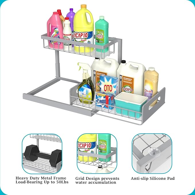 - Sliding Storage Drawer: The under sink organizer is designed as a sliding drawer with handles, can be pulled out smoothly, allowing you to easily access the items stored at the bottom.