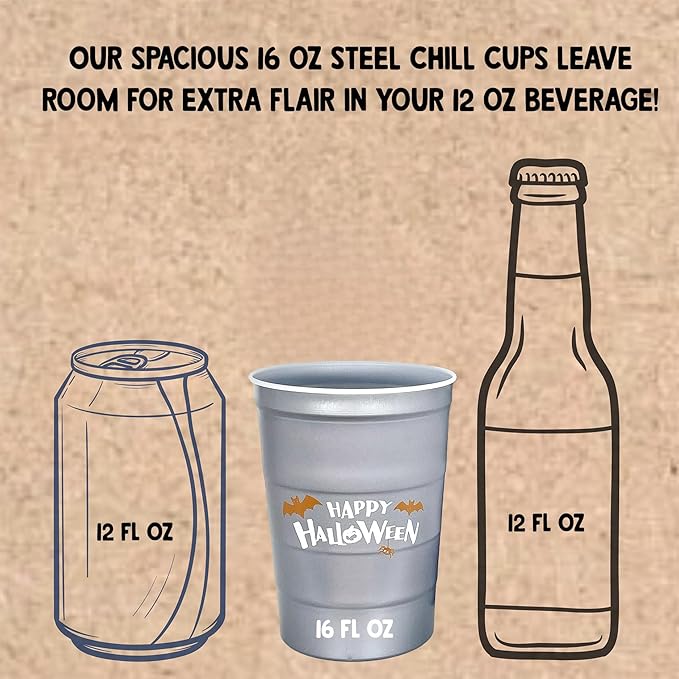 - Earth-Friendly Drinkware: Unlike plastic party cups that end up in landfills, sustainable Halloween Steel Chill Cups are 100% recyclable; reuse hand-washable cups for your corporate event
