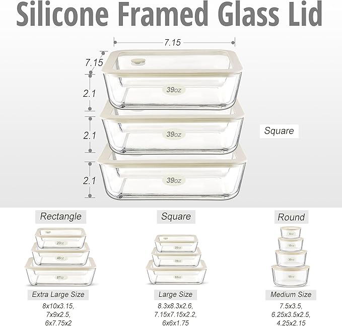- ✅WHAT’S IN THE BOX: Each set comes with the Glass containers and their matching Silicone Framed Glass Lids. SQUARE Shape Size : 39oz, (7.15x7.15x2.1) There are more sizes, colors, and shapes in other combo sets.