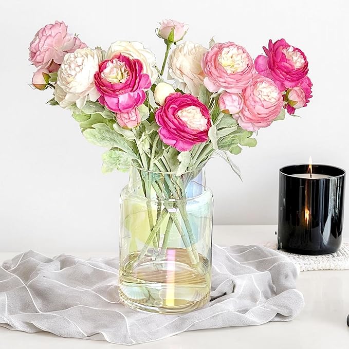 - 【Large Capacity Glass Vase】- The iridescent large glass cylinder vase is 9 inch tall, 4.7 inches in top diameter and 5.9 inches in bottom diameter, large enough to hold a bouquet of flowers. This transparent glass vase is perfect for home desktop decoration, it can not only be used for hydroponic fresh flowers and green plants, but also can be arranged with dried flowers, artificial flowers, bouquets, foliage, water, colored stones and other vase fillers for beautiful display, with simple and stylish modeling, it is easy to create an sophisticated corner of your home life.