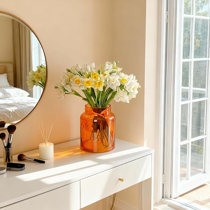 - 【Modern Glass Flower Vase】- This orange vase features a simple and stylish cylinder design, while the mouth of the vase is reduced to a certain size to achieve a more beautiful flower arrangement and is very easy to clean. This wide mouth glass vase is suitable for roses, lilies, tulips, peonies, sunflowers and more. This elegant and stylish large vase is suitable for modern farmhouse, minimalist, bohemian and classic style houses.
