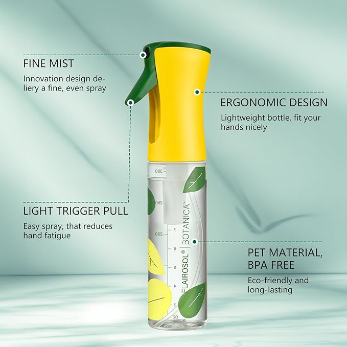 - QUALITY MATERIAL & SUSTAINABLE: The Original Flairosol fine mist spray bottle is made from PET materials. Easy to refill and reuse, and you can even create your liquid blends for plants and avoid buying unnecessary extra plastic bottles
