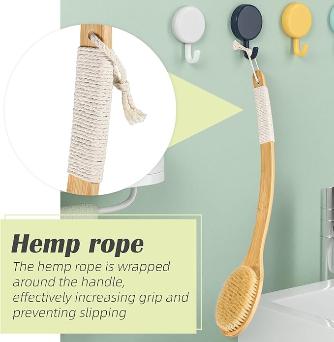 - Considerate Design -The twined hemp rope on the curved handle is greener and non-slip that is not easily falling when you having a bath. You can hanging the back body brush in bathroom, very convenient for you to use. It will be a perfect home gift.
