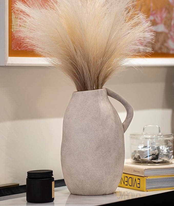 White Ceramic vase with Handle, Distressed Cement Texture, Boho Terracotta Large Pottery 10inch Tall, Rustic Farmhouse Decorative vases for Centerpieces, Unique Stoneware Jug for Flowers