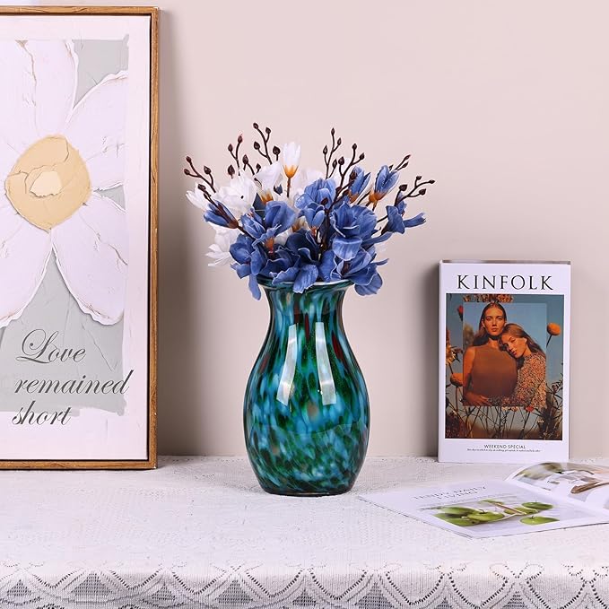 12 inch Hand Blown Glass vase, Green Glass vase, Glass Large vase Flower Decoration, Glass Art vase for Wedding Bathroom Dining Table Shelves Office Living Room Coffee Table Centerpiece vase.