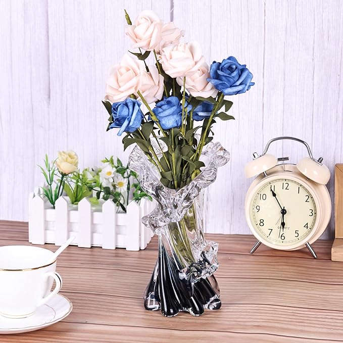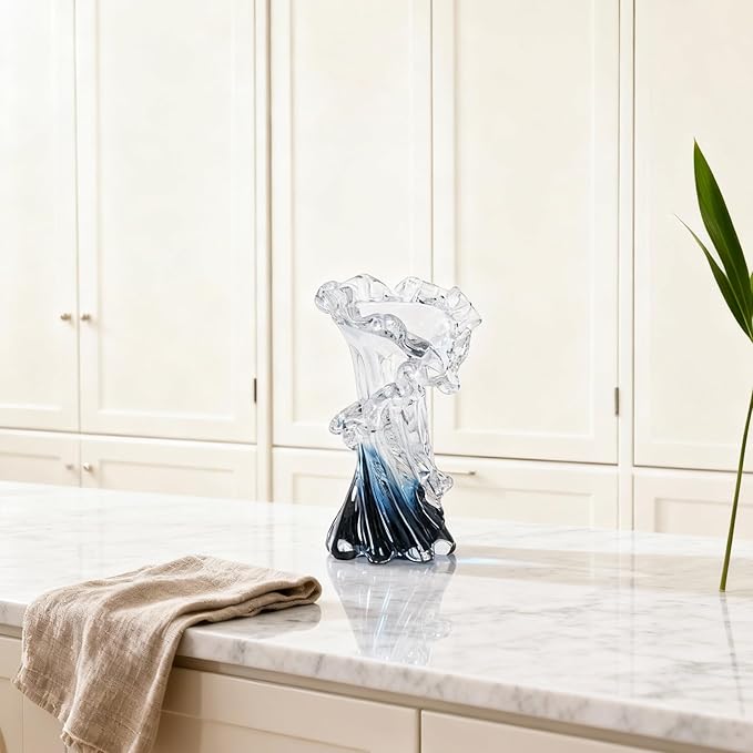 - Artisan Hand-Blown Craftsmanship: Crafted using traditional glass-blowing techniques, each blue blown glass vase is a one-of-a-kind creation, with delicate twists and turns that reflect the artisan's skill. Subtle variations in shape and bubbles add character and uniqueness, making this vase a true piece of art glass. Its carefully shaped ruffled edges and intricate details ensure it stands out as a beautiful vase in any room