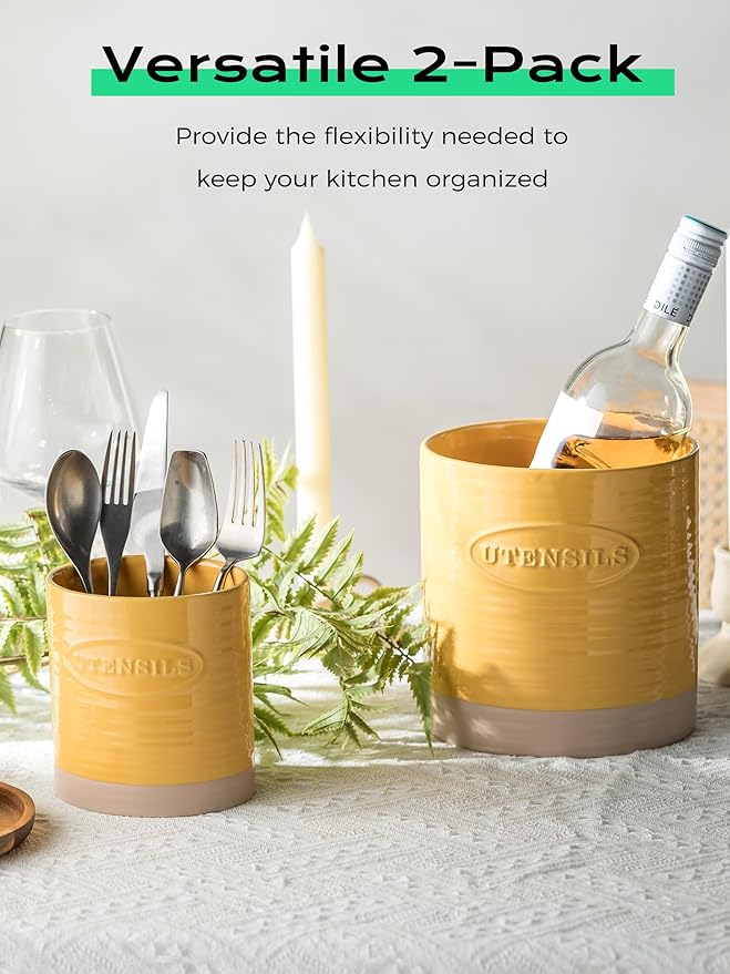 YHOSSEUN Kitchen Utensil Holder Set of 2, Ceramic Utensil Holder for Kitchen Counter, 6.7"+5.1" Cooking Utensil Crocks for Spatula, Oval Opening, Yellow