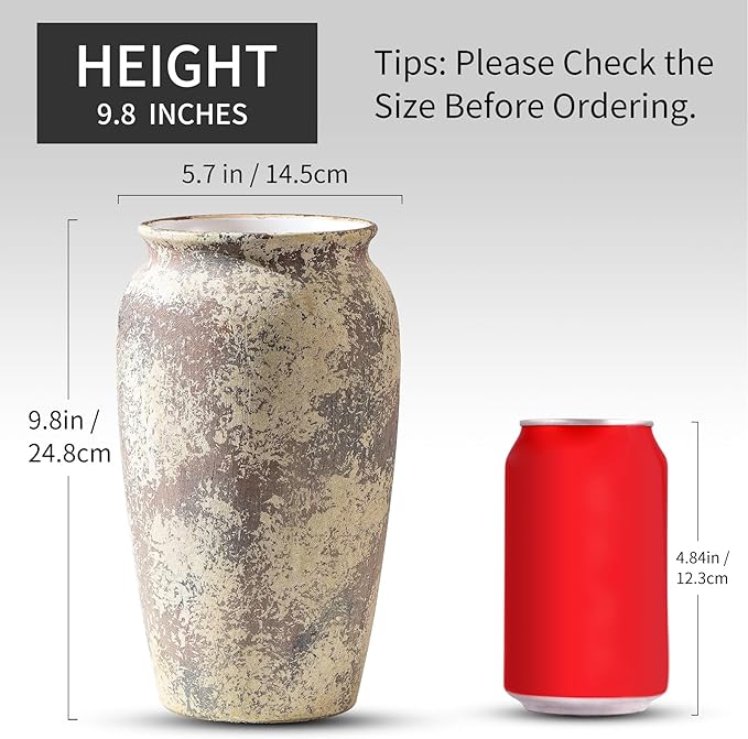 Vintage Ceramic Farmhouse Flower Large Vase, Rustic Terra Cotta Tall Floor Stone Vases, Pottery Decorative Flower Vase for Home Decor, Table, Living Room Decoration, Shelf Decor, Mantel, 9.8 Inch