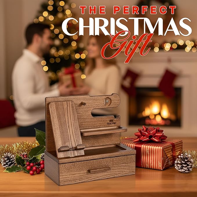 TESLYAR Wood Phone Docking Station with Drawer - Nightstand Organizer - Desk Organizer for Husband - Birthday Gifts for Men, Dad, Anniversary Idea, Key Holder Stand Watch & Accessories (Earth Beige)