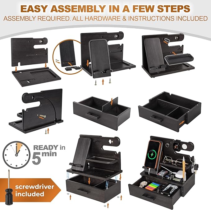- SMART DESIGN: The stand is easy to assemble (assembly manual attached) and сompatible with all kinds of smartphones; The stand with drawer also has compartments for wallets, documents, glasses, watches, fitness trackers, bracelets, keys, stationary etc