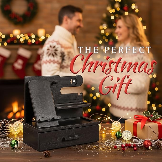 TESLYAR Wood Phone Docking Station with Drawer - Nightstand Organizer - Desk Organizer for Husband - Birthday Gifts for Men, Dad, Anniversary Idea, Key Holder Stand Watch & Accessories (Granite Black)