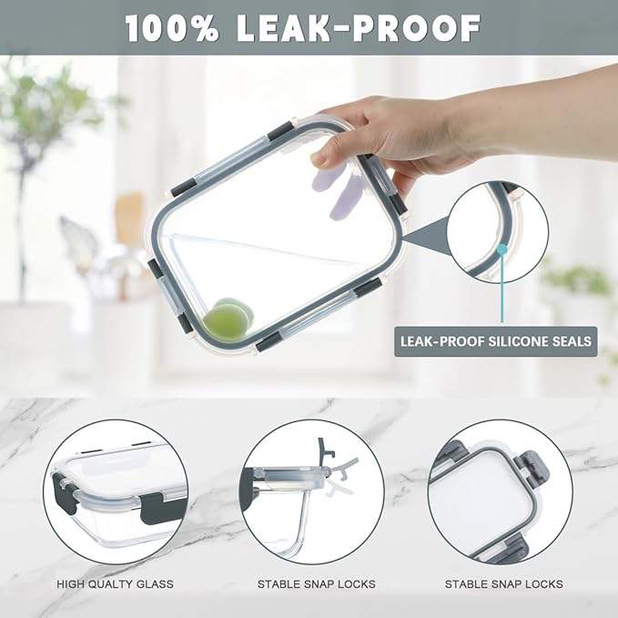 KAMOTA Glass Food Storage Containers, 10 Pack Glass Meal Prep Containers, Airtight Containers with Snap-Lock Lids, 34 oz and 13 oz gray Container Set with Lids, for Microwave/Oven/Freezer/Dishwasher