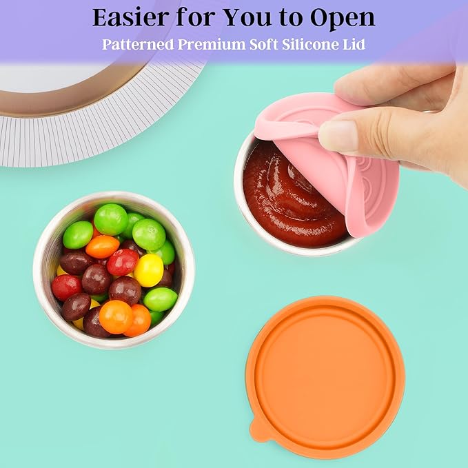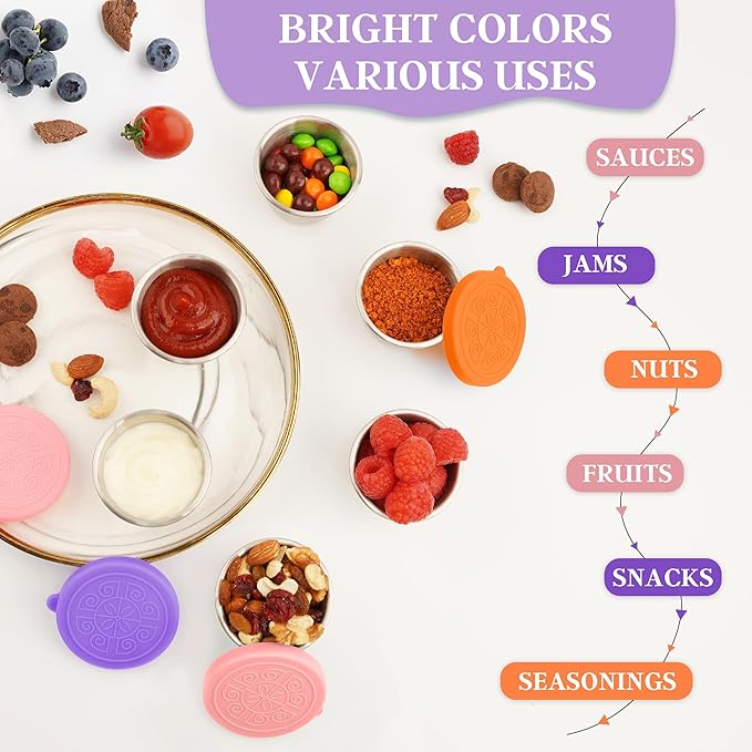 - 【EASY-OPEN COLORFUL LID】: The soft silicone lid of the sauce cups is not only cute, but also very easy to put on and take off. The colorful silicone lid set not only accommodates a variety of preferences, but can also be used to easily differentiate between different sauces in the container, making your meal prep and kitchen storage more convenient
