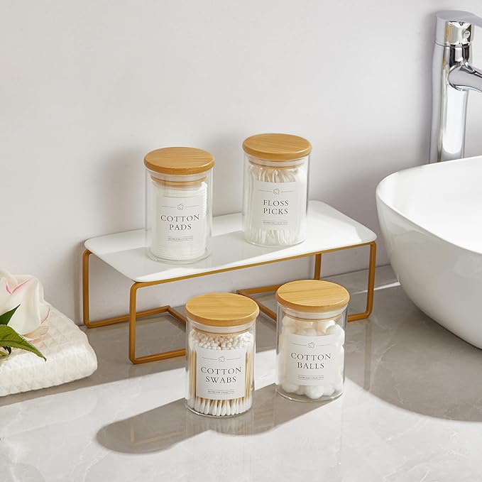 - Qtip Holder Bathroom Set: The q tip holder set includes 3 pack glass bathroom containers jars; 6 labels with black pre-printed words (Cotton Swabs, Cotton Balls, Cotton Pads, Floss Picks, Hair Ties, Bath Salts); and 3 blank labels.