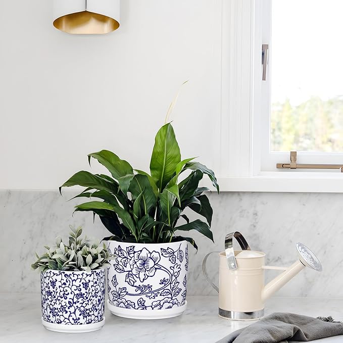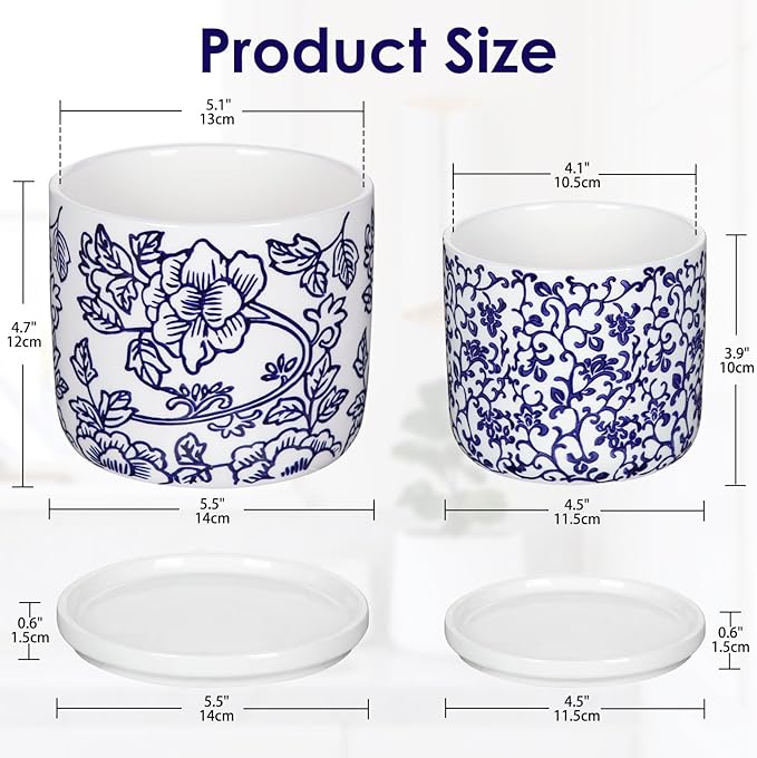 - Premium Quality: Crafted from sturdy ceramic porcelain, these blue and white planters complete smooth texture inner & outside makes them clean easily. Each planter with tray is wrapped with thick foam to avoid damage during transportation