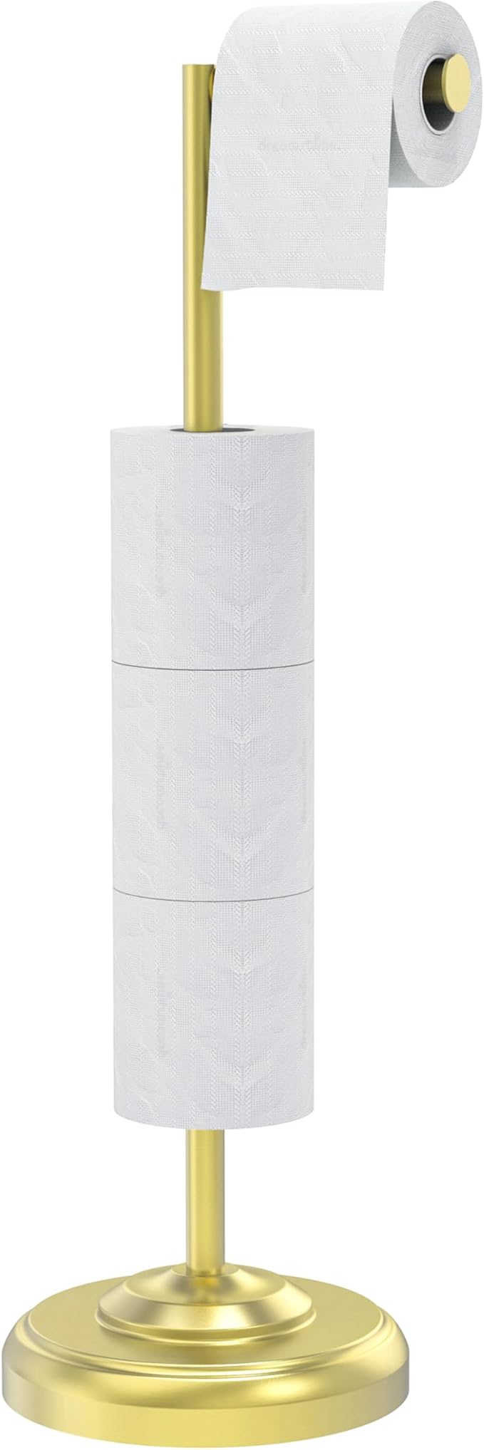 - GENEROUS STORAGE CAPACITY: This freestanding gold toilet paper holder can store up to 4 extra toilet paper rolls, providing convenient storage and ensuring you never run out of toilet paper. Keep your bathroom organized and fully stocked with this space-saving toilet paper storage organizer.