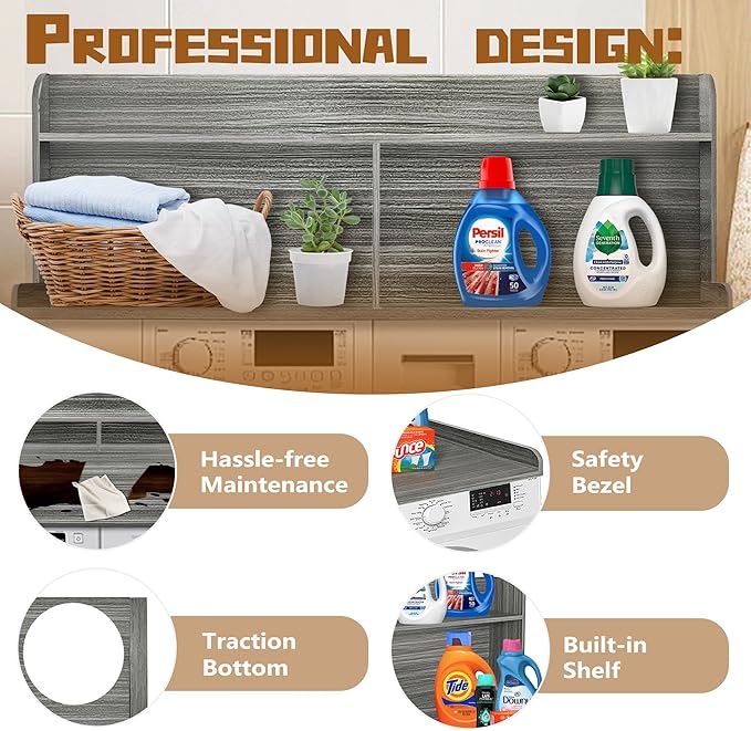 - 【Versatile and Efficient Storage Solution】Beyond serving as a base for your washer and dryer, this countertop offers exceptional storage capabilities. Its generous surface is perfect for organizing laundry essentials and functions as a convenient sorting station or even a temporary workspace. This versatile design adapts to your needs, making it an indispensable asset in your laundry room.