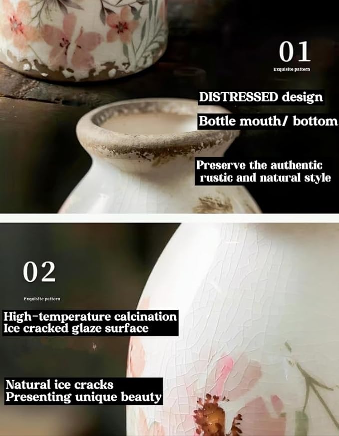 - RUSTIC STYLE DESIGN: This ceramic floral vase set has a country rustic style design inspired by antique pots, featuring delicate hand-painted floral motifs and enameled accents.