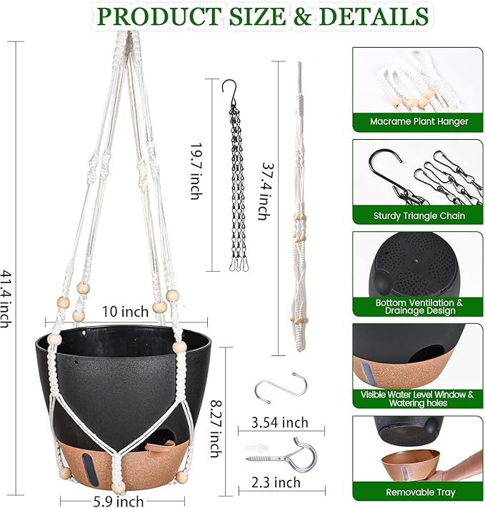 - 【Smart Self-Watering System】 Our hanging plant pots come with a REMOVABLE RESERVOIR TRAY that stores 7-10 day water supply. Absorbent cotton ropes automatically deliver moisture to soil when needed - ideal for vacations or busy lifestyles. Spend less time watering hanging baskets for indoor plants!