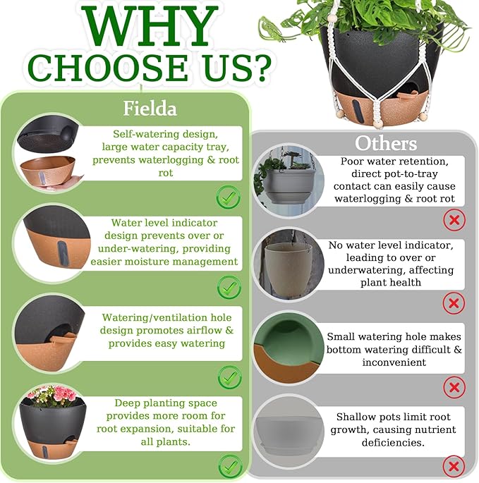 - 【Never Over/Underwater Again!】Fielda's indoor hanging planters feature an EXCLUSIVE WATER WINDOW in the base tray - instantly check moisture levels without guesswork! Protect your plants from dehydration and promote healthy root systems with this visual watering guide. Perfect for hanging pots for indoor plants enthusiasts who value scientific plant care.