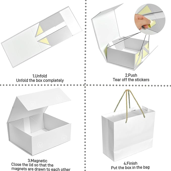 - Elegant White Packaging:The white gift box paired with a matching bag, measures 9.8x7.9x4 inches. Its collapsible design offers ample space for chocolates, cosmetics, jewelry, and more.