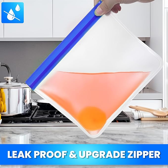 - DURABLE, LEAKPROOF, AND BPA-FREE PEVA: Made from thick, food-grade silicone (0.30mm), these reusable zip lock bags are extra durable, leak-proof, and safe for storing hot or cold food. BPA-free and non-toxic bags, they’re a safe and sustainable choice for storing everything from liquids to dry goods without worrying about spills or contamination.