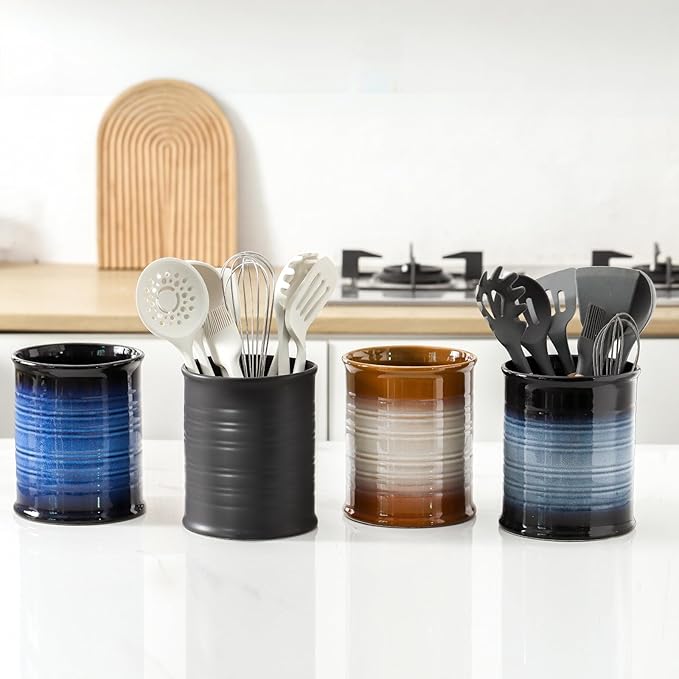 - 【LARGE SIZE】Large and deep ceramic utensil holder.7.2″H*6″W inches,super large enough for larger and longer cooking utensils, keeping utensils handy and findabe.A convenient solution for overflowing kitchen drawers and countertop clutter.