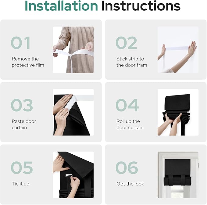 - 🌸EASY HANGING: The package includes 1 door curtain panel and 1 adhesive strip. It can be easily installed without any tools or curtain rods. Just follow our instructions picture to install, put the sticky strip on the glass, and join together with the sticking place on the door curtain panels firmly.