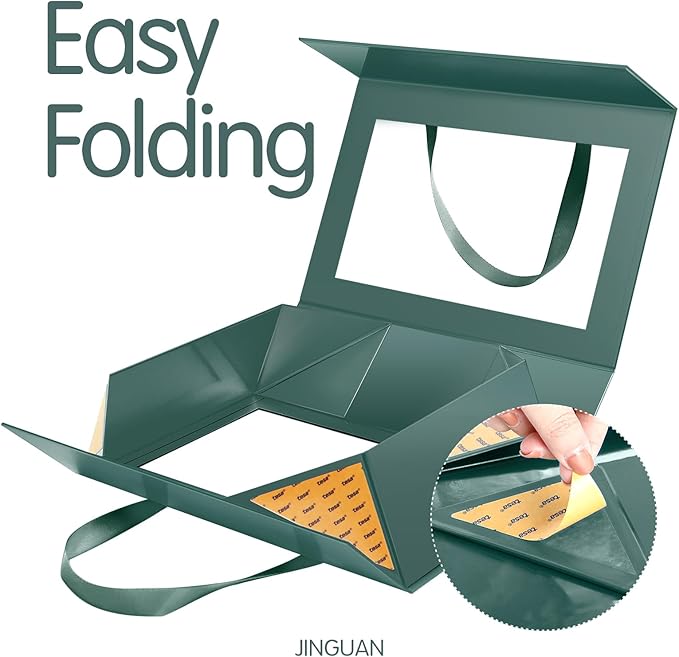 Large Green Clear Gift Boxes, 13.5x9x4.1 Inches Gift Boxes with Windows by Handles, Bridesmaid Proposal Boxes, Collapsible Gift Boxes with Magnetic Closure (Glossy Green, 5 Pack)