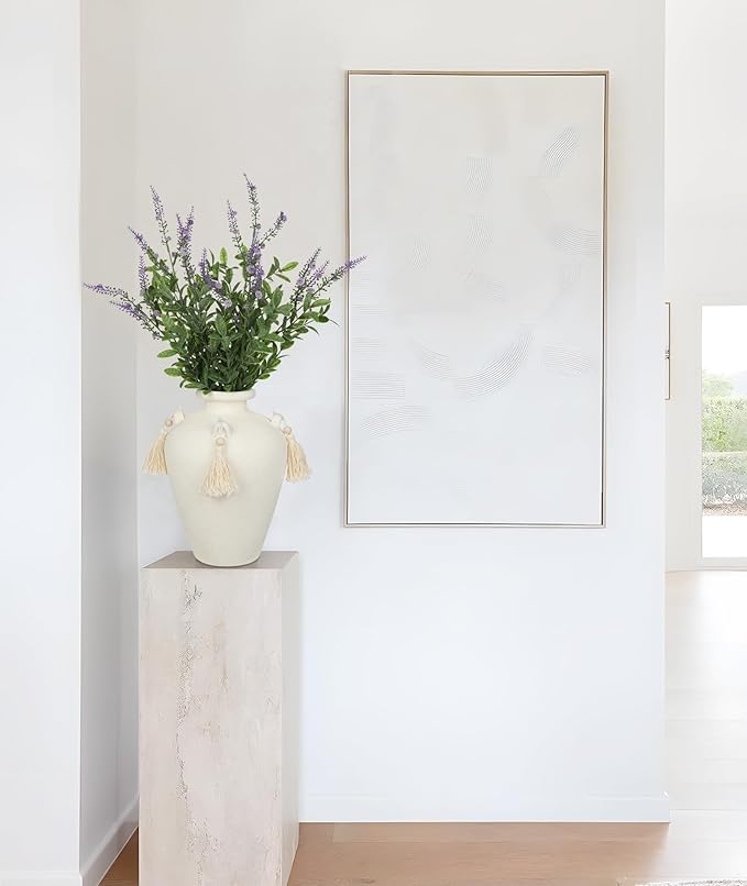 - UNIQUE ANTIQUE DESIGN.This white ceramic vase features a charming four-ear design, cream tassels, and a curved vintage silhouette that adds rustic elegance to any home décor. The narrow mouth makes farmhouse vase ideal for pampas grass, dried flowers, artificial flowers, greenery stems, while the weighted anti-slip base keeps white flower vase stable. The timeless design of large white vase brings a calm, nostalgic warmth.