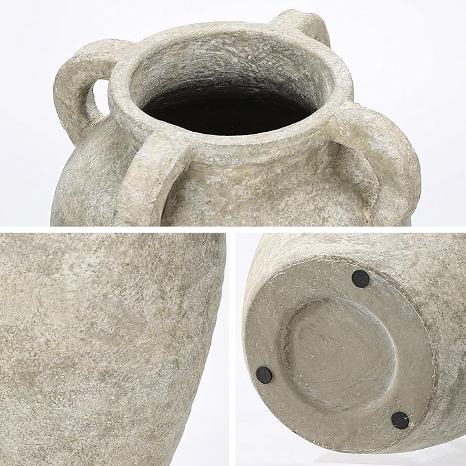 - Featuring three handles, and a rough unfinished matt exterior, our large decorative vase seamlessly integrates into any space, adding a touch of history and enduring elegance to your home. It's the perfect addition to your bookcase, kitchen styling, console styling or grouped together on a shelf with other decor pieces. Versatile and sophisticated.