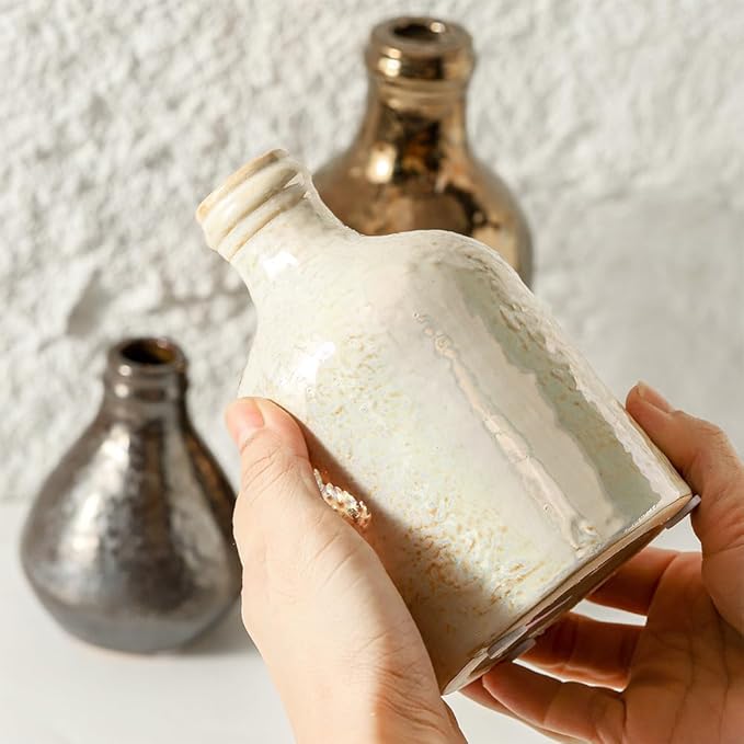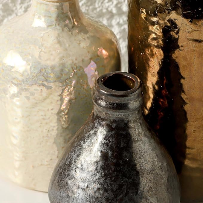 - 【Ceramic Vase Set of 3】Length X Diameter = 8.7X3.4", 5.9X3.4", 4.1X3.4". A ceramic vase set, but looks metallic. The uneven texture of the surface with its special color, gives it a different visual effect in different light. Its beauty is waiting for you to explore.