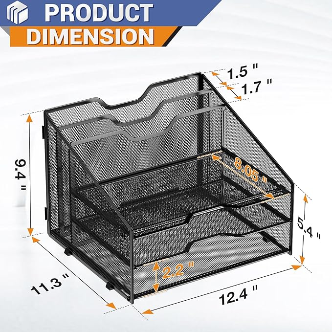 - Dimensions: 12.4"L x 11.3"W x 9.4"H, each horizontal tray :12.4" x 8.05" x 2.2" inch(L x W x H); 2 file holder: 12.4" x 9.4" x 1.5" inch(L x H x W)