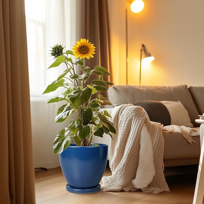 10 Inch Plant Pot - Ceramic Planter with Drainage Hole and Saucer, Modern Flower Pot, Round Planters for Indoor Plants, Home Patio Bathroom Porch Garden Living Room Decor, Blue