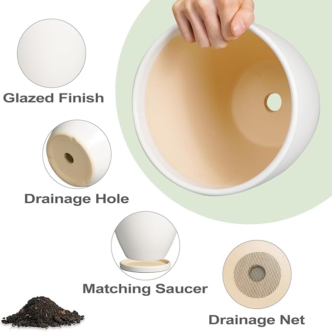 - Plant Pots with Drainage Holes and Saucers: The drainage holes can effectively remove excess water from the ceramic planter to avoid root rot; while the ceramic plant tray can catch excess water seeping out from the bottom of the ceramic flower pot to keep the home environment tidy