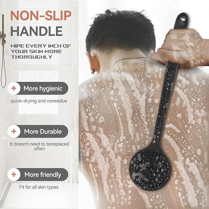 - PORTABLE AND DURABLE: With a convenient hanging hole, our silicone bath scrubber is perfect for home or travel use. The soft silicone bristles and non-slip handle ensure durability and ease of use.