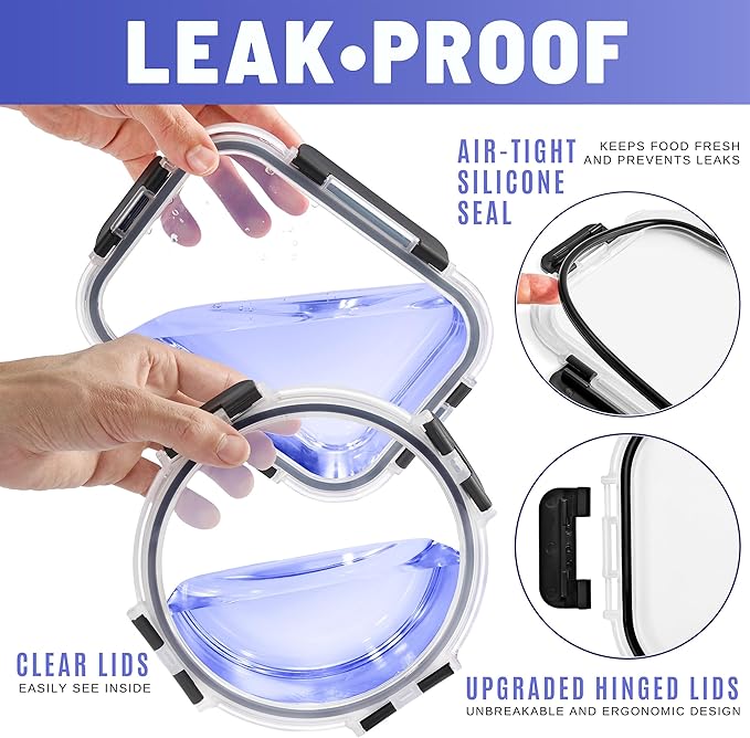 - Keeps Food Fresh and Secure: Each storage container for food features a four-sided locking lid with an airtight silicone seal to preserve freshness and prevent leaks. Glass containers for food storage stack easily in the refrigerator, freezer, or cabinet.