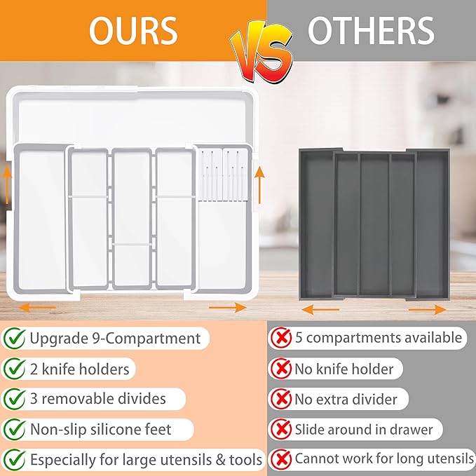 - Maximized Organization: Homecor upgraded Large Utensil Organizer boasting 9 compartments with 3 removeable dividers. Three expandable panels on the left, right, and top maximize space for storing most cooking utensils in the kitchen, such as spatulas, ladles, wine opener, tongs, utensil sets, and whisks. Streamline your kitchen drawer and create additional room with our versatile utensils drawer organizer