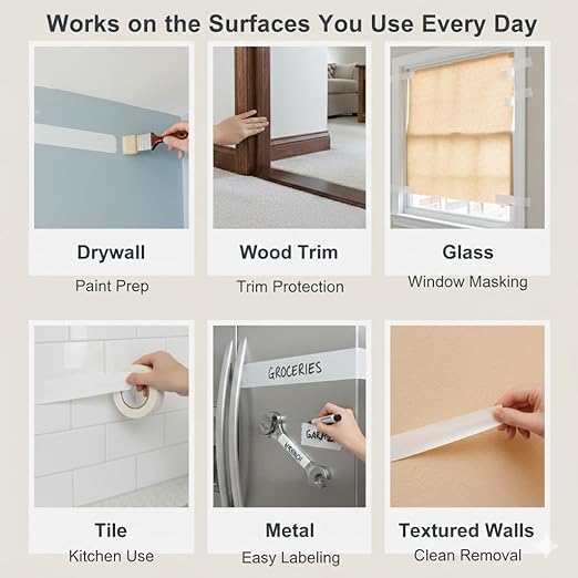 - 【Clean Lines, Easy Removal】This white painter tape delivers sharp paint lines without bleeding. It removes cleanly without leaving residue, perfect for walls, trim, and delicate surfaces