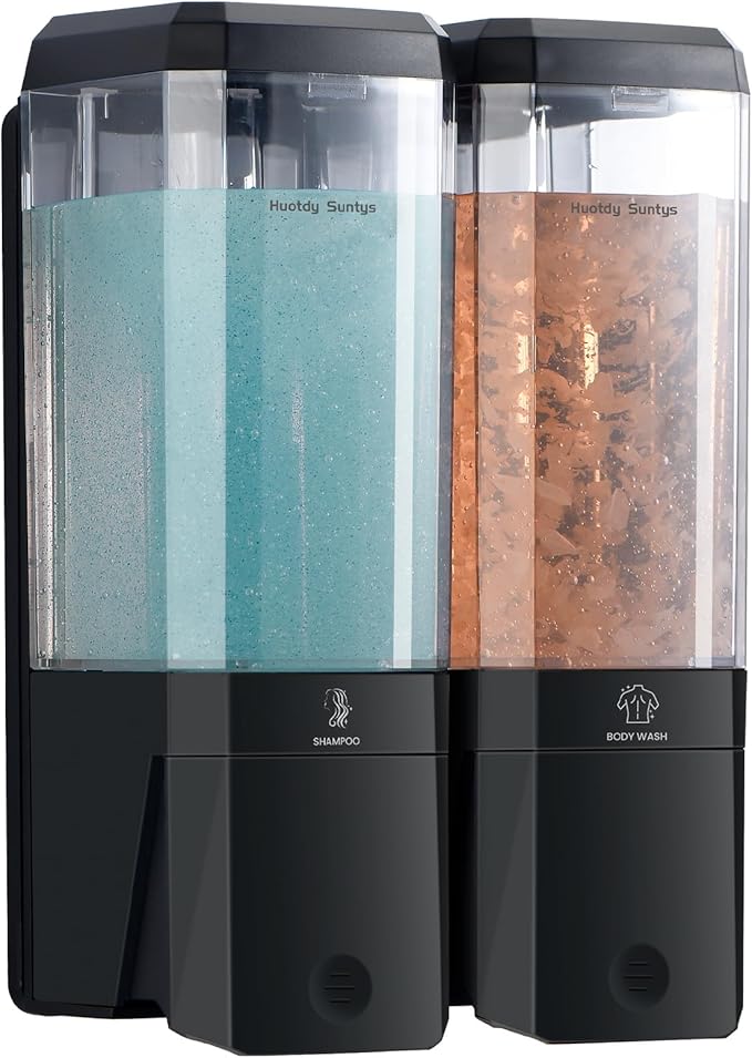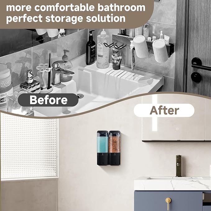 - 💎Large Capacity & Easy Refill: Our shower soap dispenser boasts 2 chambers, each with 500ml capacity, ensuring a half-year supply per filling, ideal for family use. The large diameter and visible window facilitate easy and timely refills.