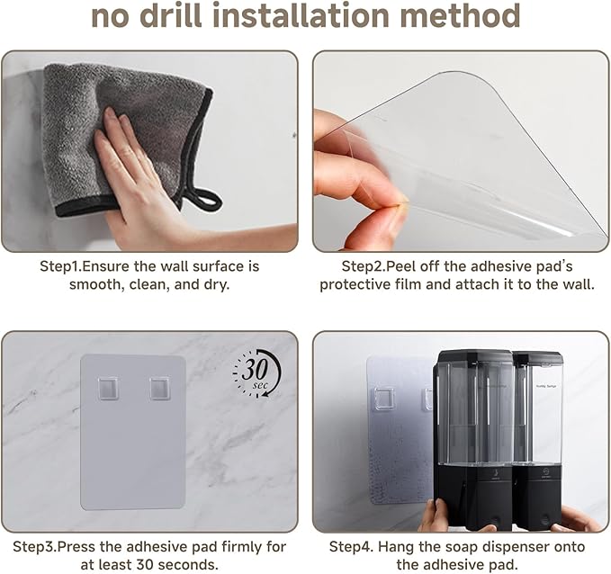 - 💎Thoughtful Detail Design: Wall-mounted installation saves countertop space, keeping your bathroom tidy. No drill avoids wall damage. The lock feature on shampoo dispenser for shower adds safety for public places and homes with kids. The non-slip thumb button enables easy one-handed use.